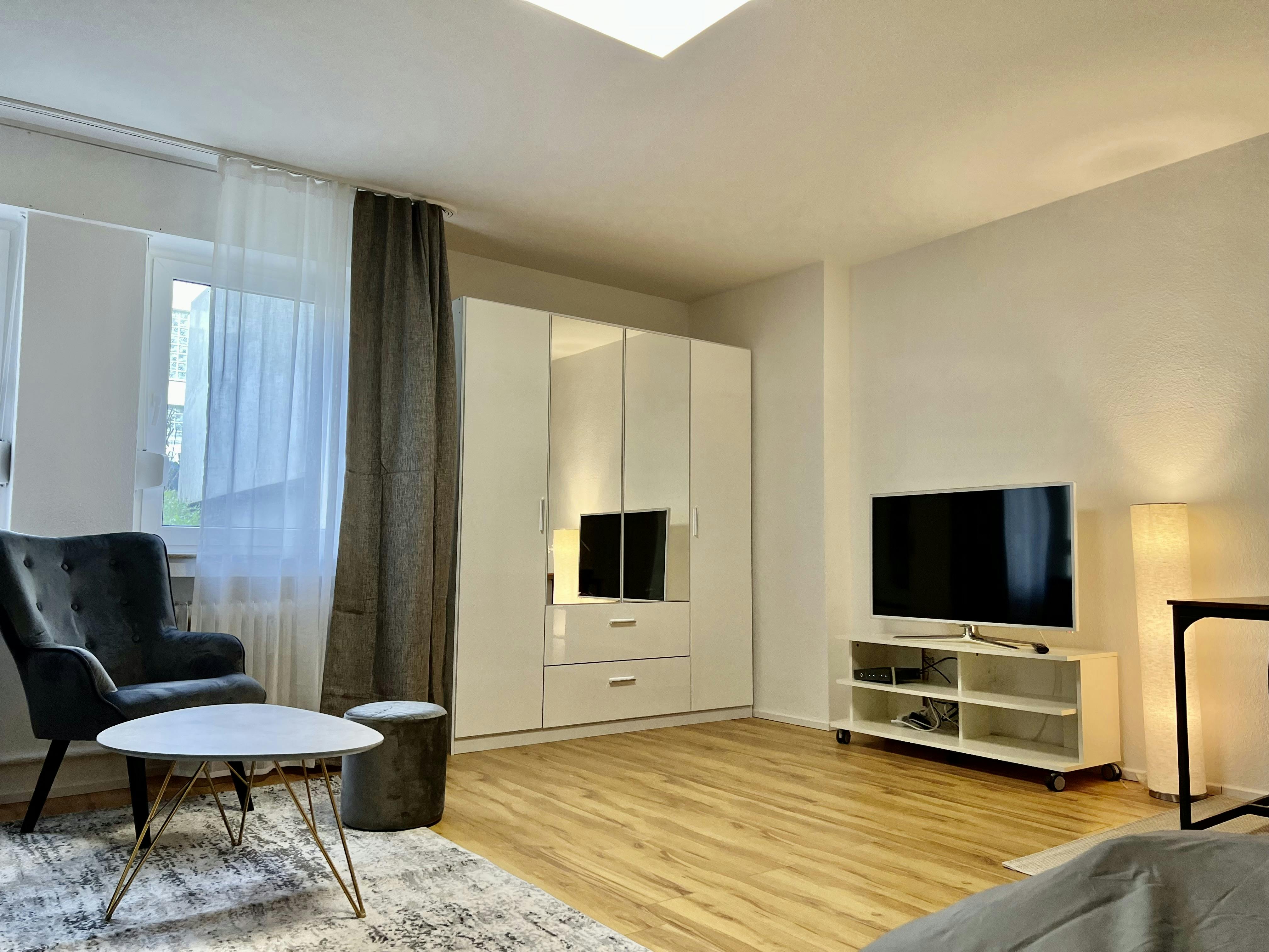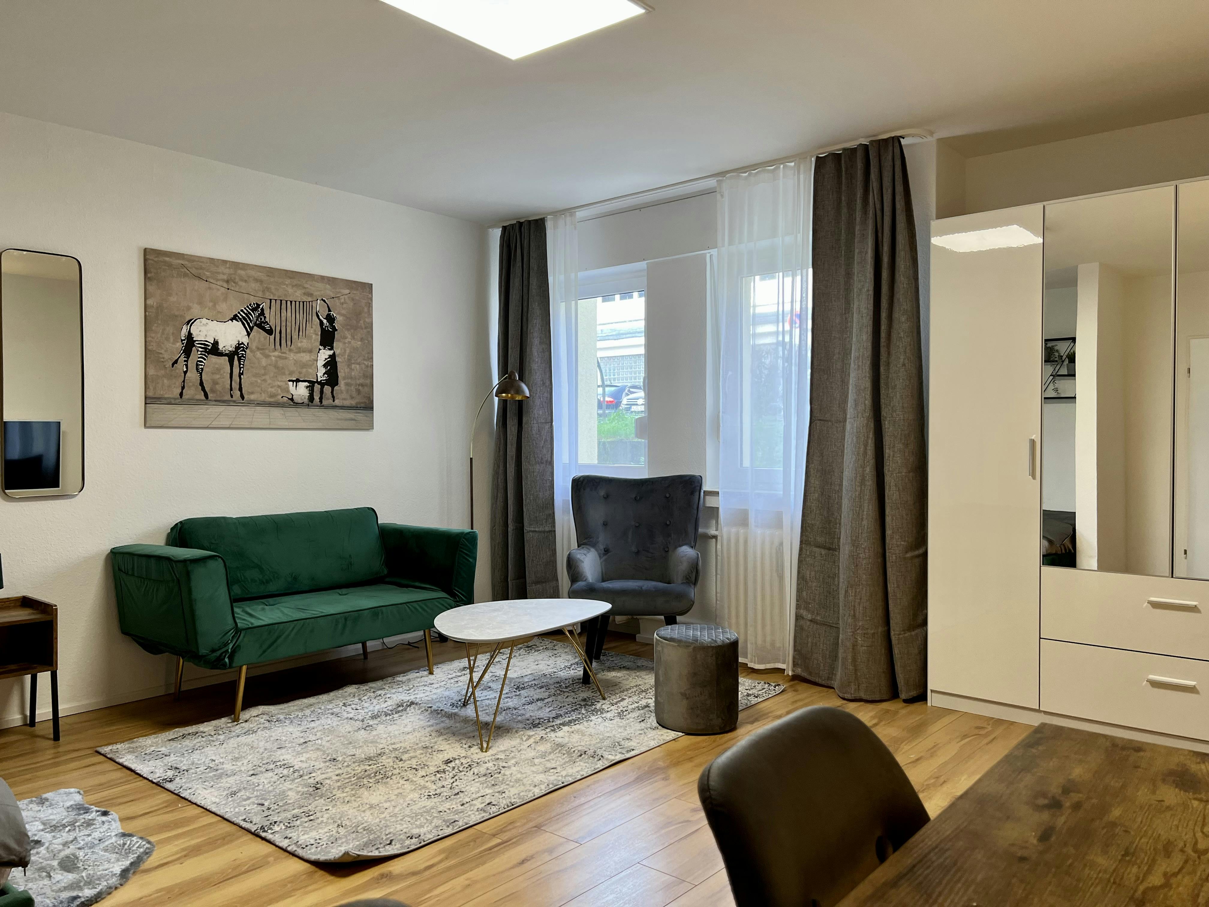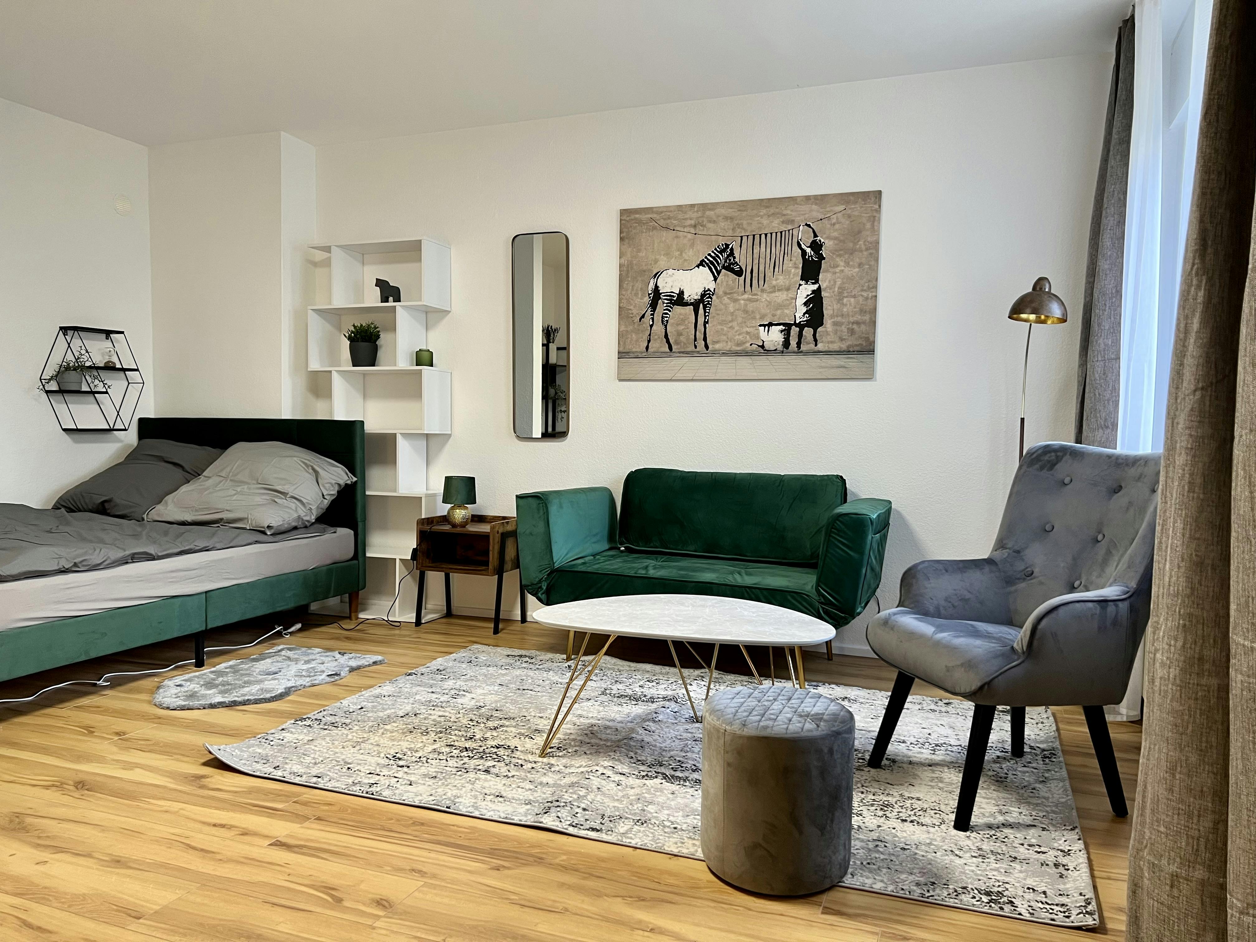 Möbliertes und designtes Studio-Apartment (37qm) in einer ruhiger Seitenstraeße in Köln Ehrenfeld. Das Apartment liegt im Erdgeschoss eines Mehrfamilienhauses, und ist sehr hell und geräumig. Es hat einen Wohn/Schlafbereich mit einem 1,40x2m großen Bett, einem Arbeitsplatz/Esstisch und ein kleines Schlafsofa. Zudem gibt es eine separate Küche, ein separates. Duschbad, und einen geräumigen Eingangsbereich (Flur). Übersicht monatliche Kosten: MIETE inkl. Möbel & allgemeine Betriebskosten: 990 EUR /Monat ZUSÄTZLICHE KOSTEN: Pauschale für Heizung, Strom, Internet: 200 EUR /Monat ES GIBT (KOSTENLOSE) PARKPLÄTZE AUF DER STRASSE. Highlights: Küche mit 4 Cerankochfeldern, Backofen, Dunstabzug, Marken-Waschmaschine (Toplader) und Spülmaschine, Mikrowelle, Smart-TV mit Internetanschluss und Kabel-TV, WIFI (100Mbit),...