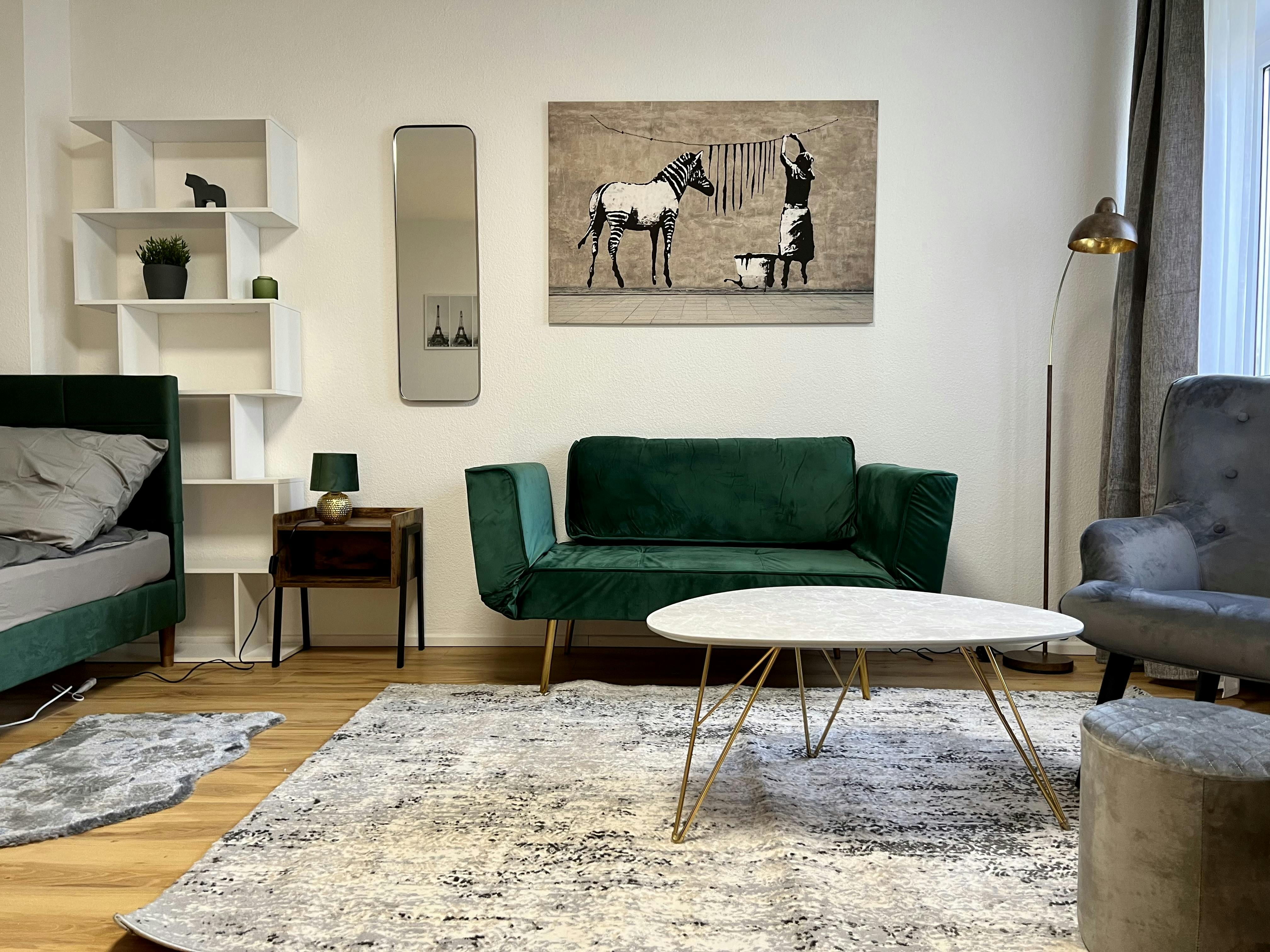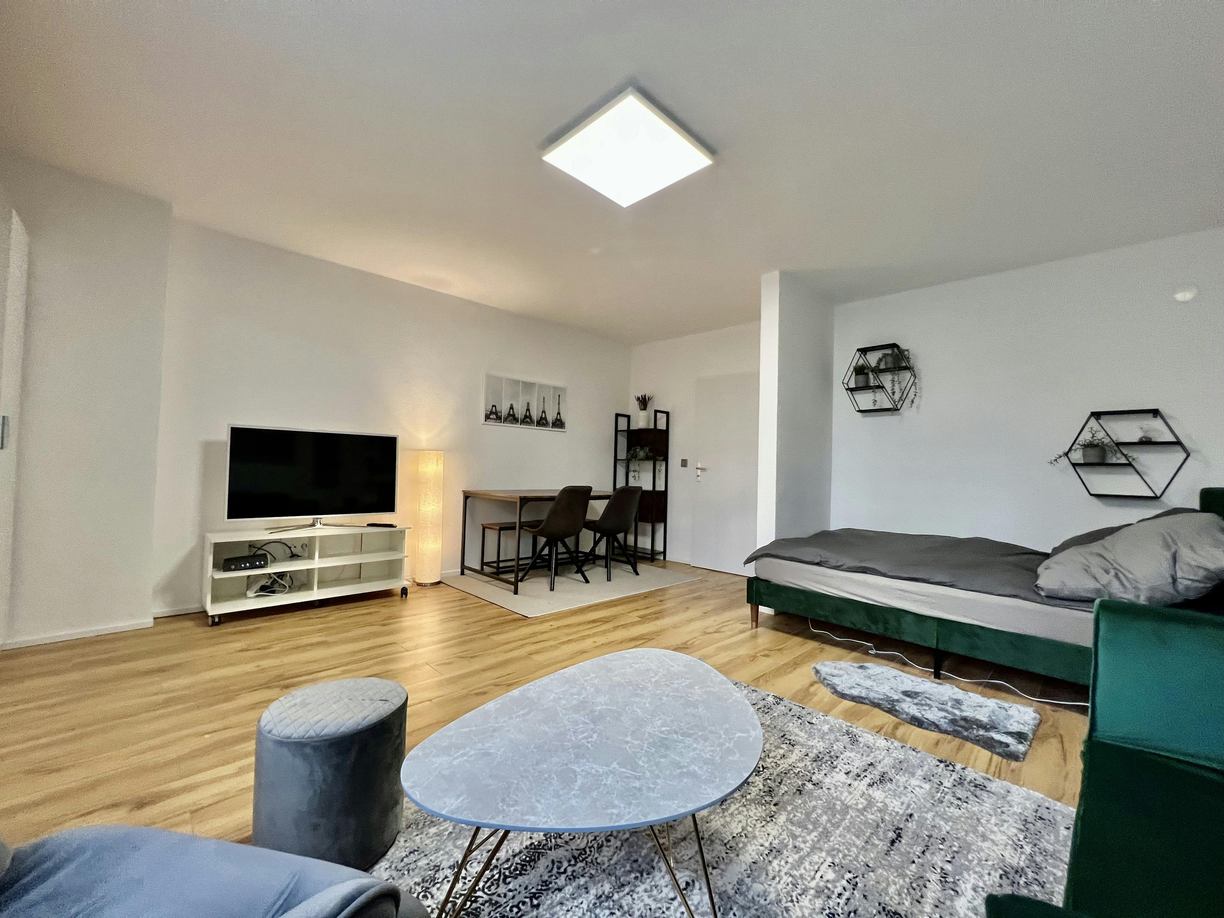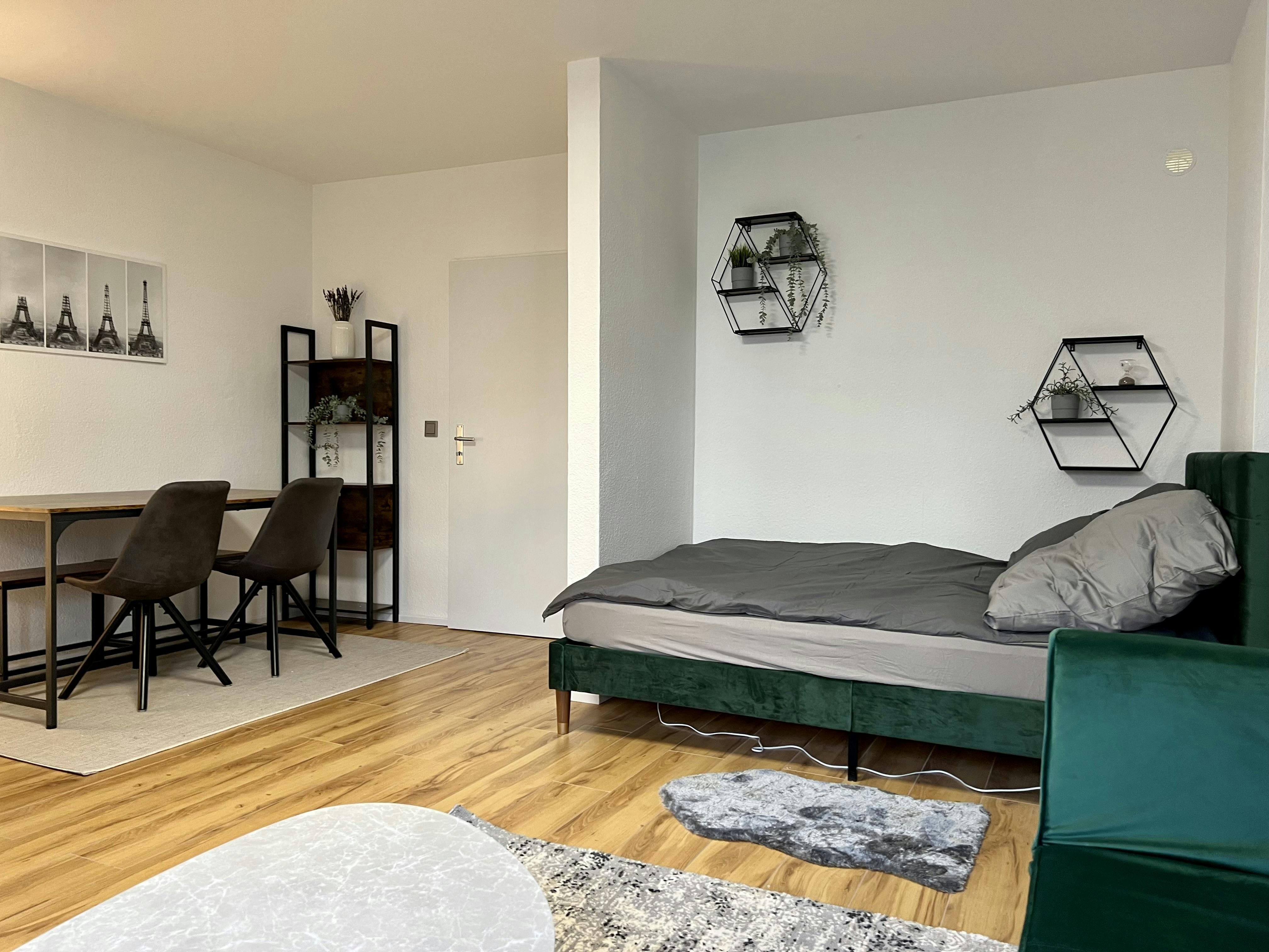 Möbliertes und designtes Studio-Apartment (37qm) in einer ruhiger Seitenstraeße in Köln Ehrenfeld. Das Apartment liegt im Erdgeschoss eines Mehrfamilienhauses, und ist sehr hell und geräumig. Es hat einen Wohn/Schlafbereich mit einem 1,40x2m großen Bett, einem Arbeitsplatz/Esstisch und ein kleines Schlafsofa. Zudem gibt es eine separate Küche, ein separates. Duschbad, und einen geräumigen Eingangsbereich (Flur). Übersicht monatliche Kosten: MIETE inkl. Möbel & allgemeine Betriebskosten: 990 EUR /Monat ZUSÄTZLICHE KOSTEN: Pauschale für Heizung, Strom, Internet: 200 EUR /Monat ES GIBT (KOSTENLOSE) PARKPLÄTZE AUF DER STRASSE. Highlights: Küche mit 4 Cerankochfeldern, Backofen, Dunstabzug, Marken-Waschmaschine (Toplader) und Spülmaschine, Mikrowelle, Smart-TV mit Internetanschluss und Kabel-TV, WIFI (100Mbit),...