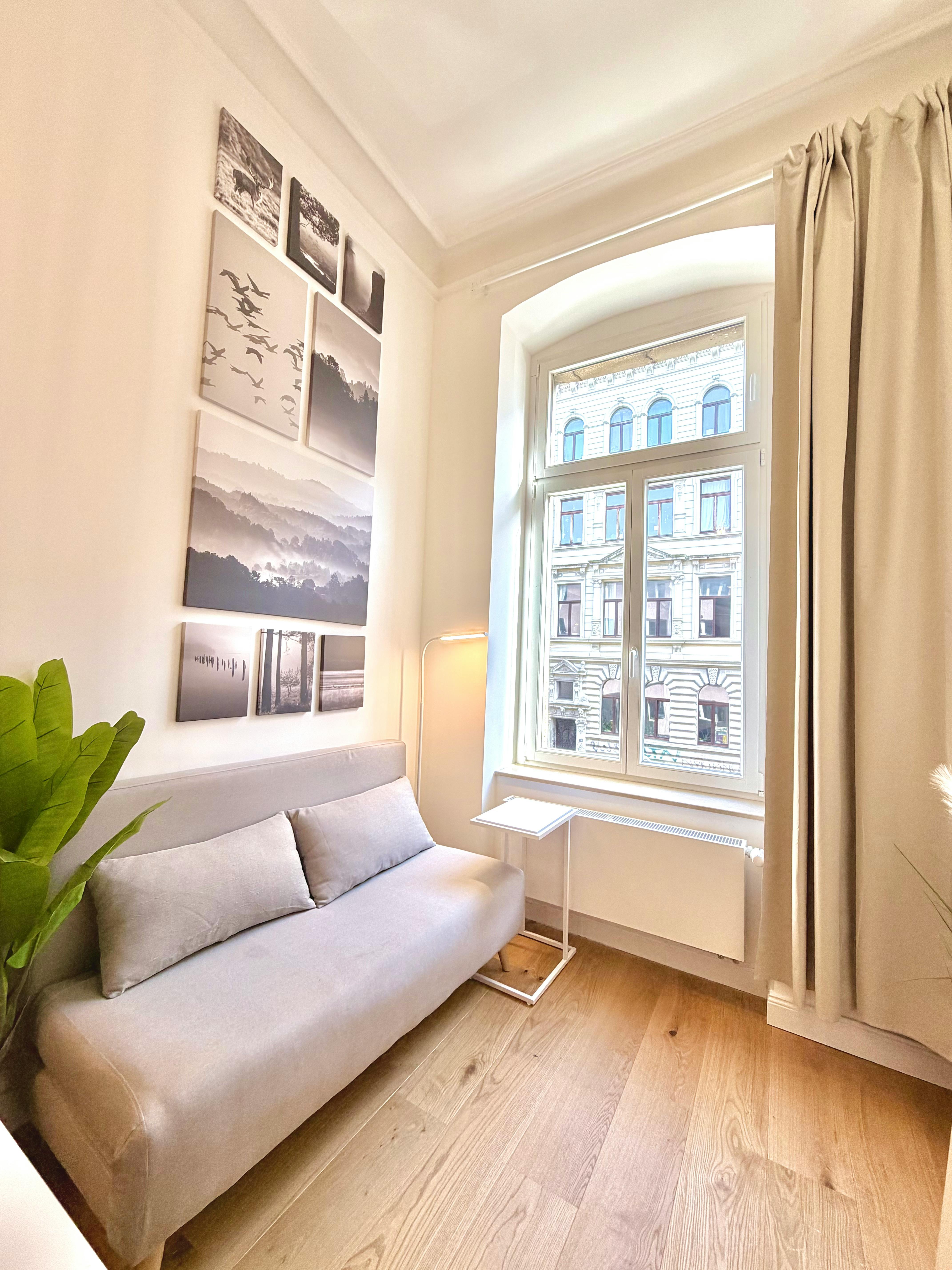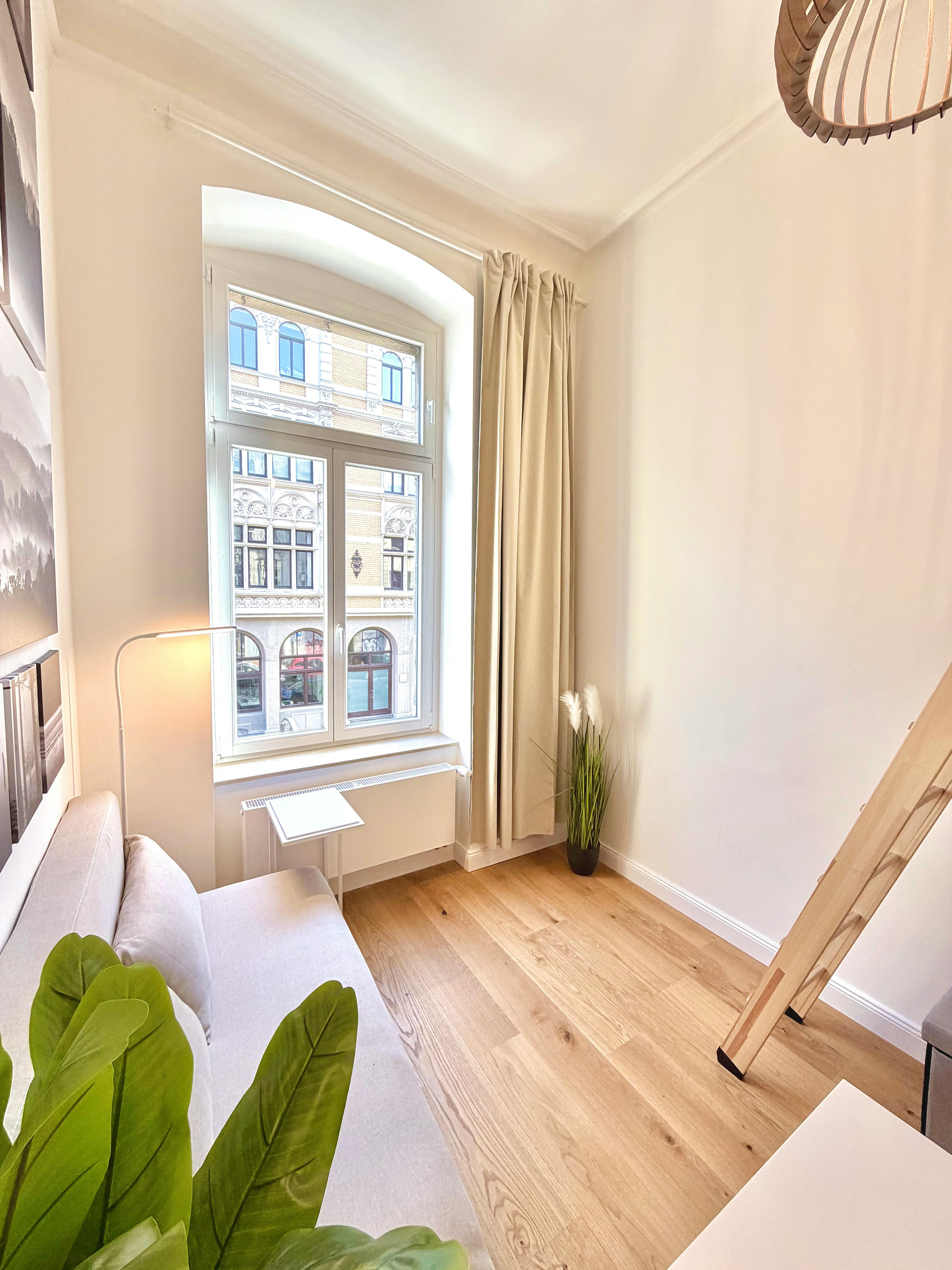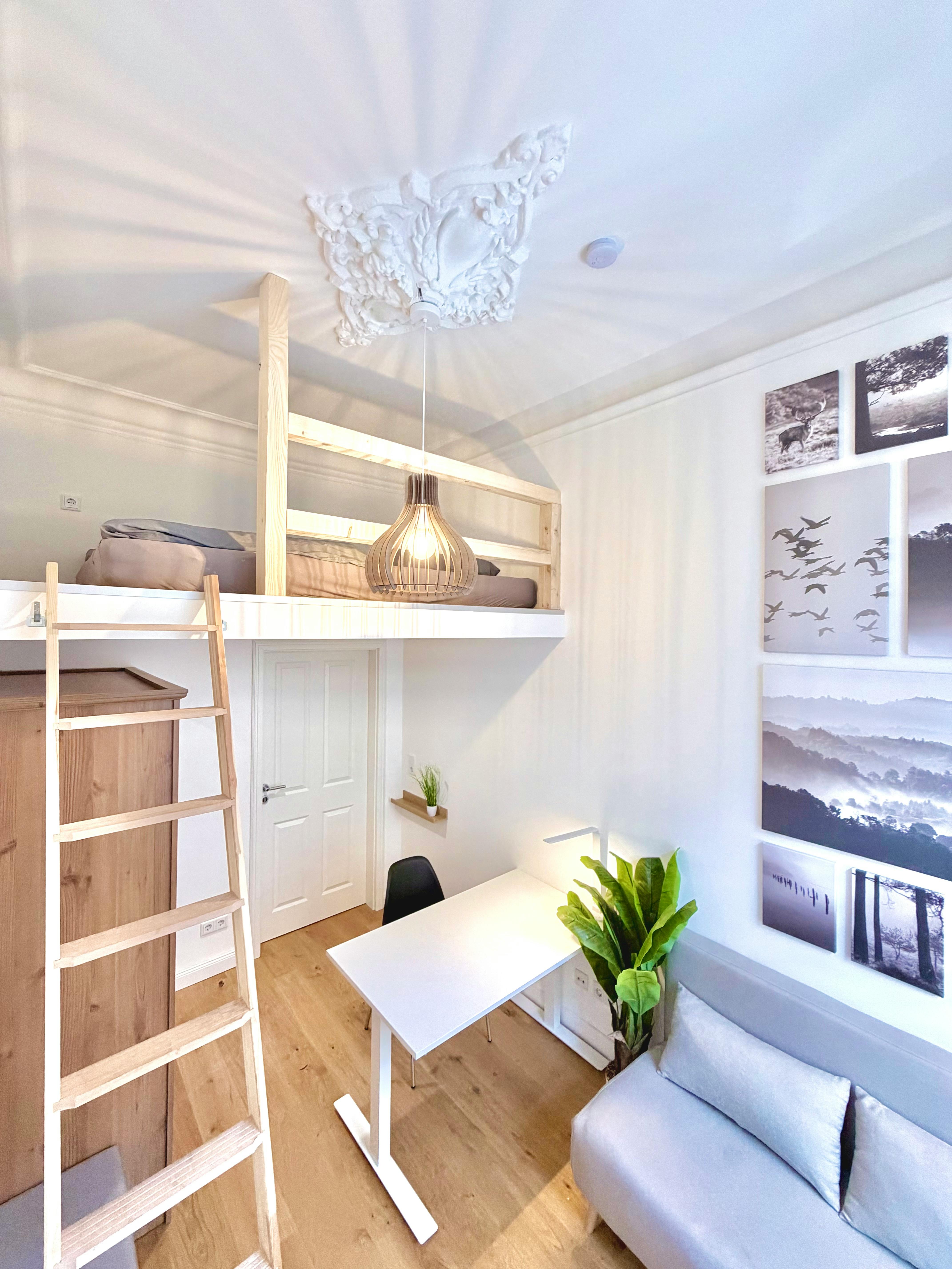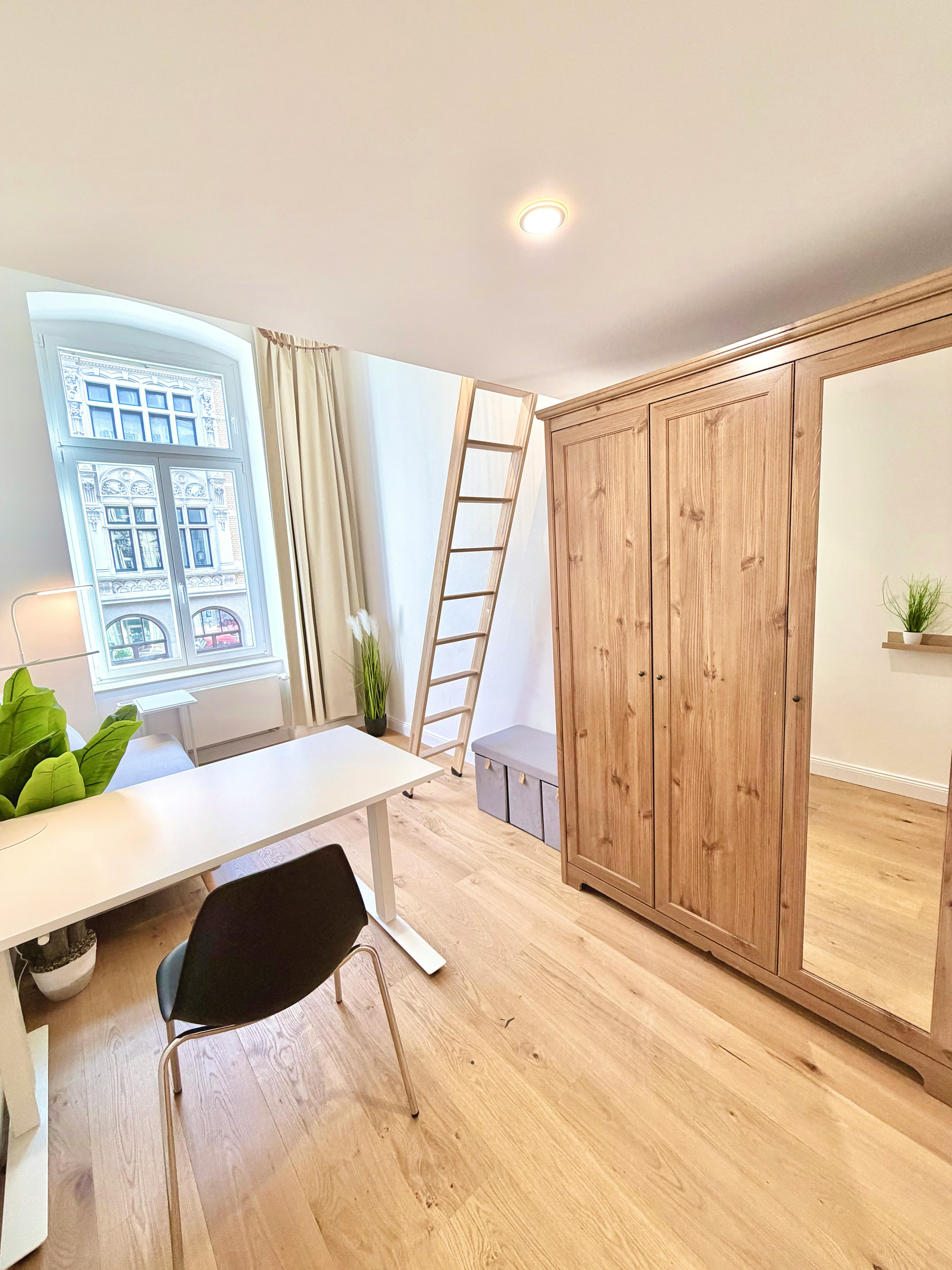 Welcome to your new, bright shared room! This spacious room will win you over with its classic old building charm: high ceilings and large windows create a friendly, light-flooded ambience. The room is labeled “b” and offers you an inviting, feel-good atmosphere. You will be part of a newly formed apartment share for 5 people in a freshly renovated apartment. The two modern bathroom has been completely renovated and offers you both a shower and a toilet so that you can start the day in a relaxed manner without having to rush in the morning. What is particularly attractive about this offer...