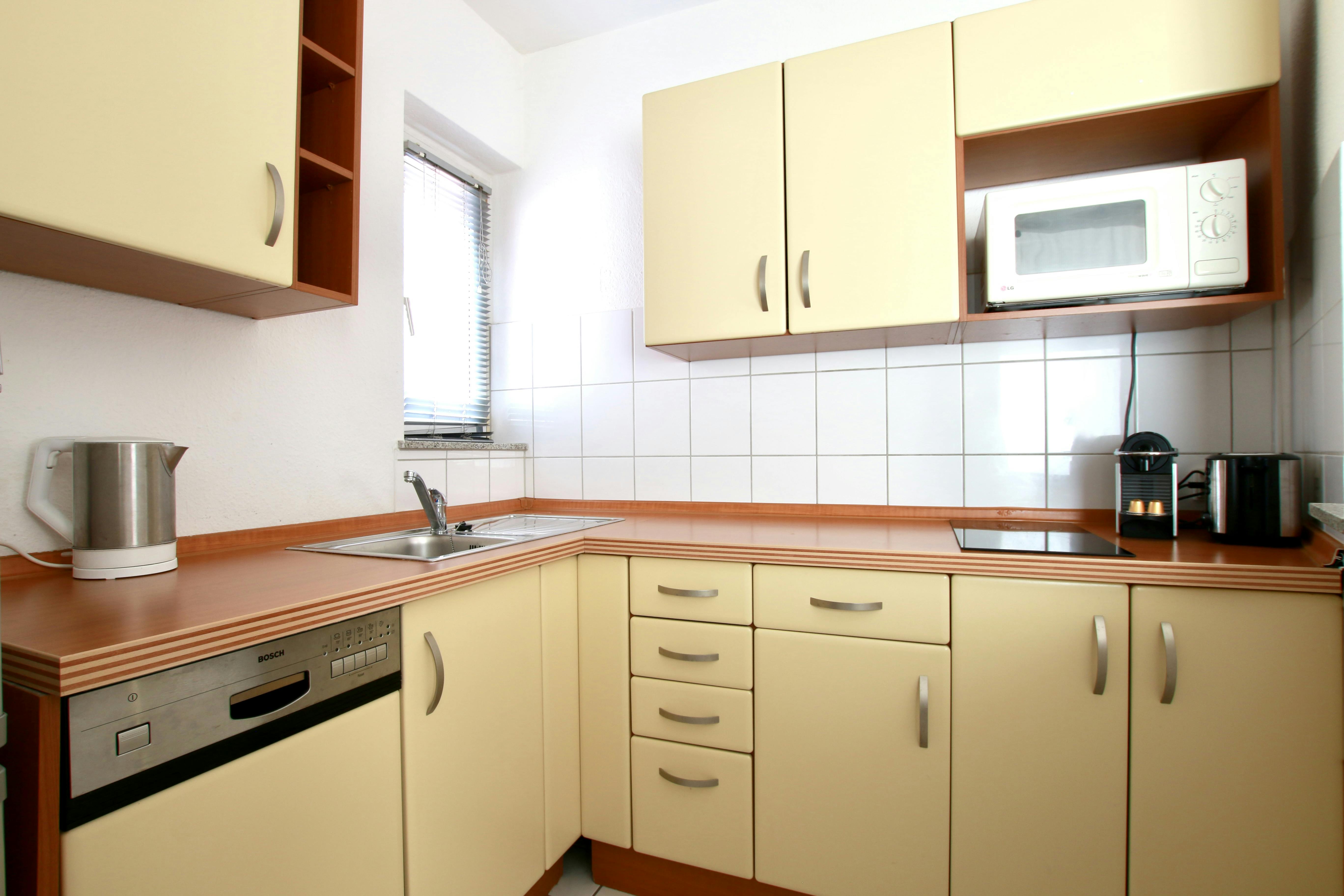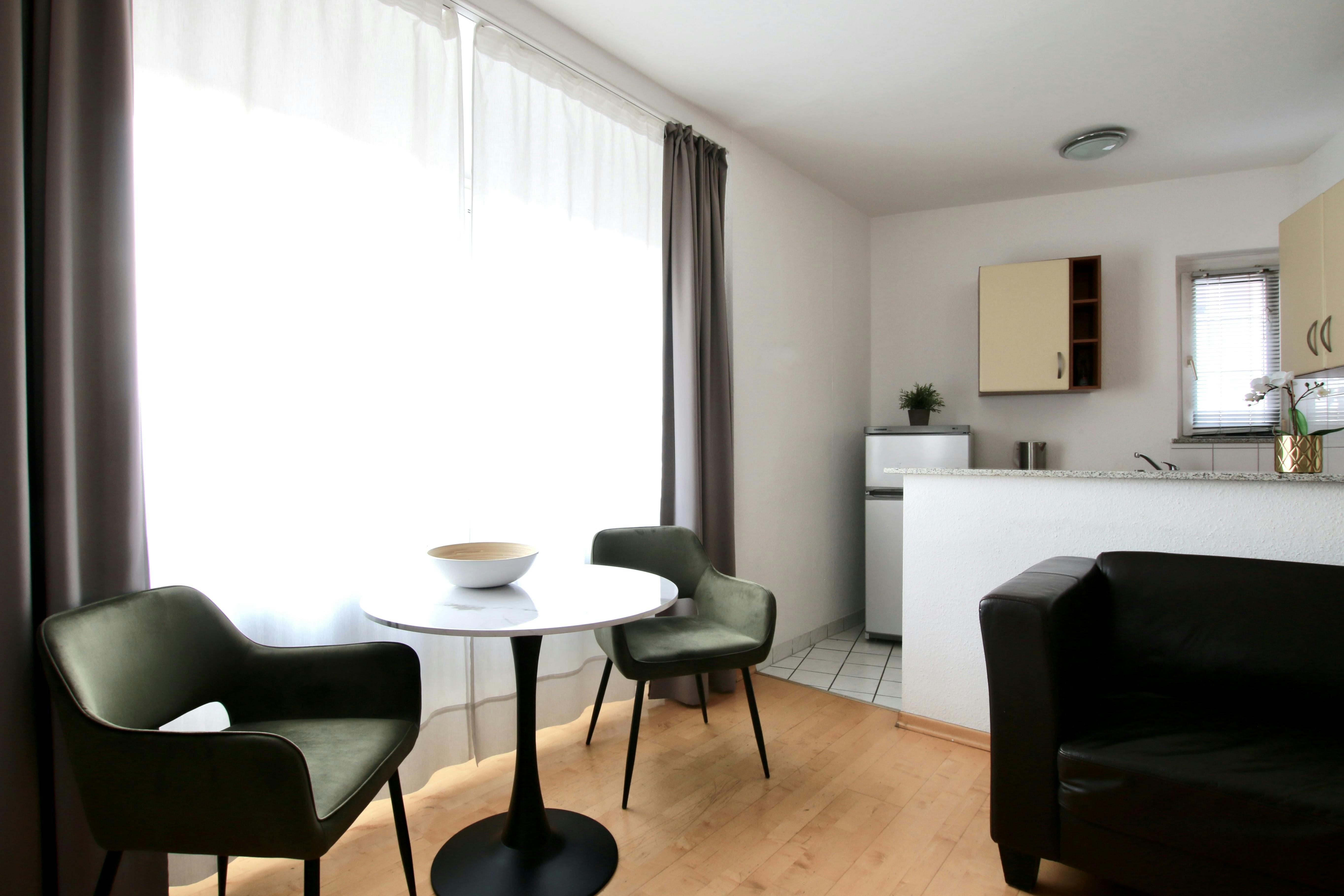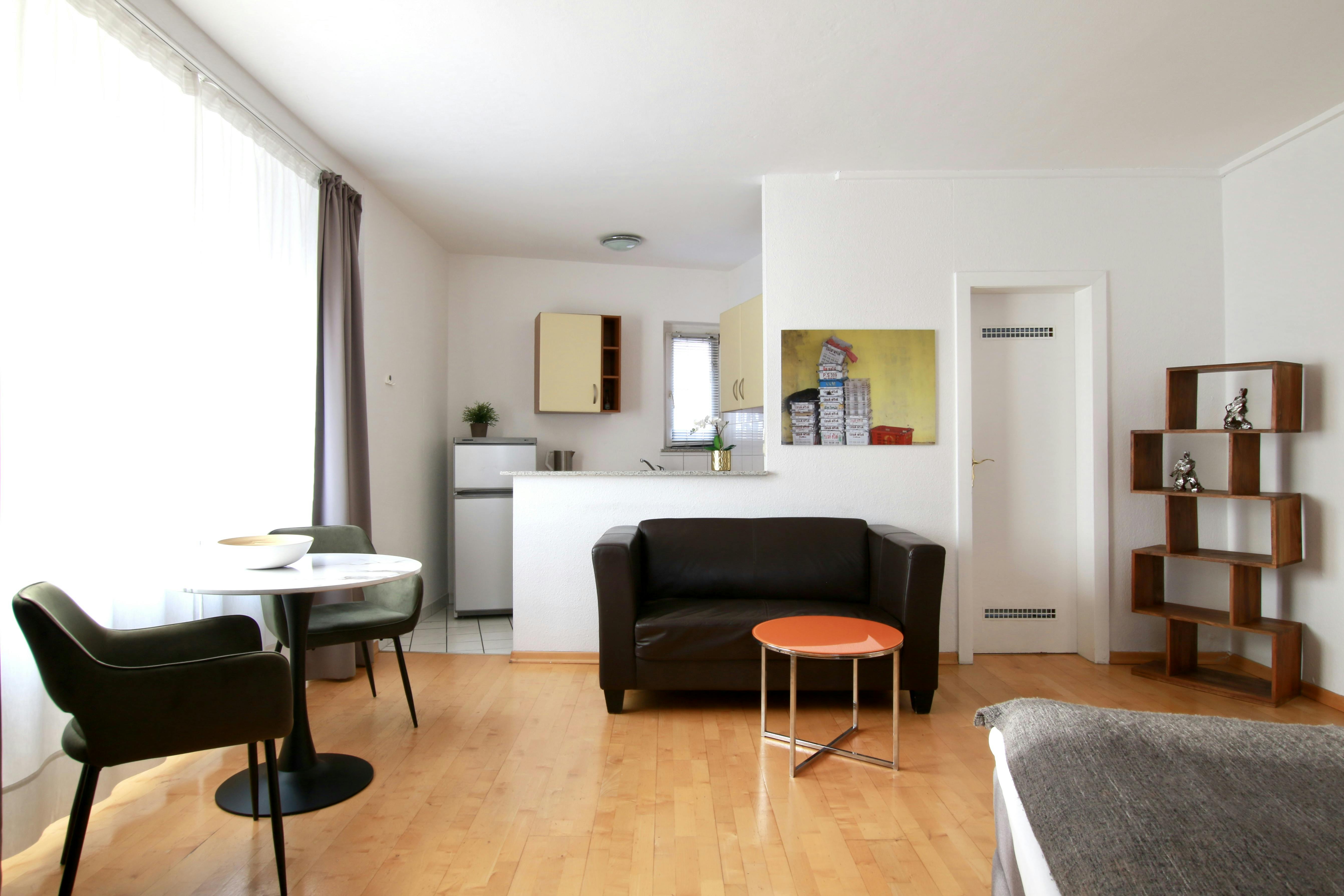 Studio apartment in the Belgian Quarter 36 sqm studio apartment (for 1-2 persons) on the 2nd floor of a 6-story apartment building at a street corner in the vibrant Belgian Quarter. The open-plan living room with laminate flooring features a box-spring bed (180 cm width), wardrobe, ironing board & iron, sofa, armchair, TV, a small bathroom with shower & hairdryer, and a fully equipped kitchen with refrigerator, ceramic hob, kettle, coffee machine, toaster, and microwave. Free Wi-Fi is available. There is a laundry room with coin-operated washing machines and dryers in the basement. A weekly cleaning service (including the change of bed...