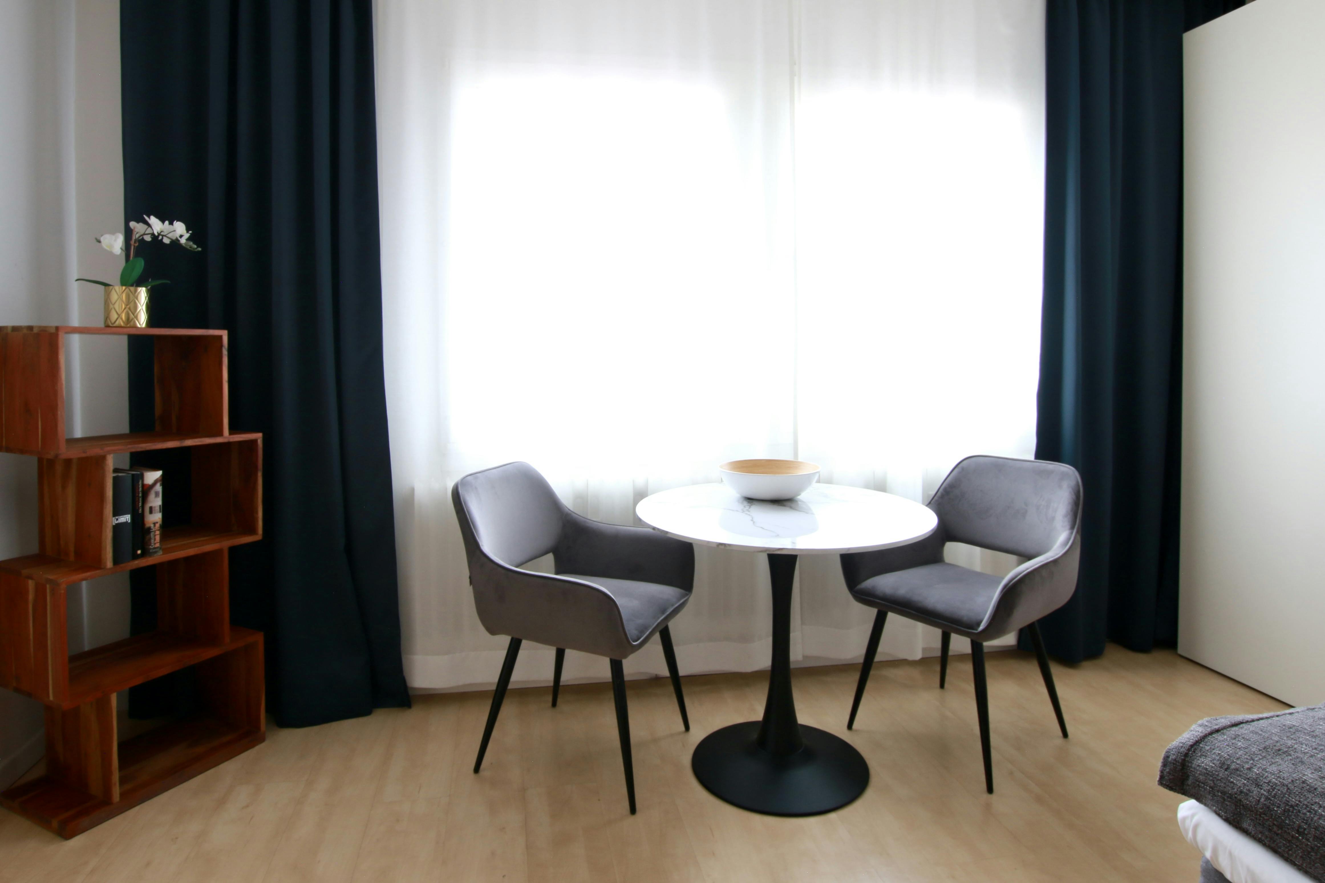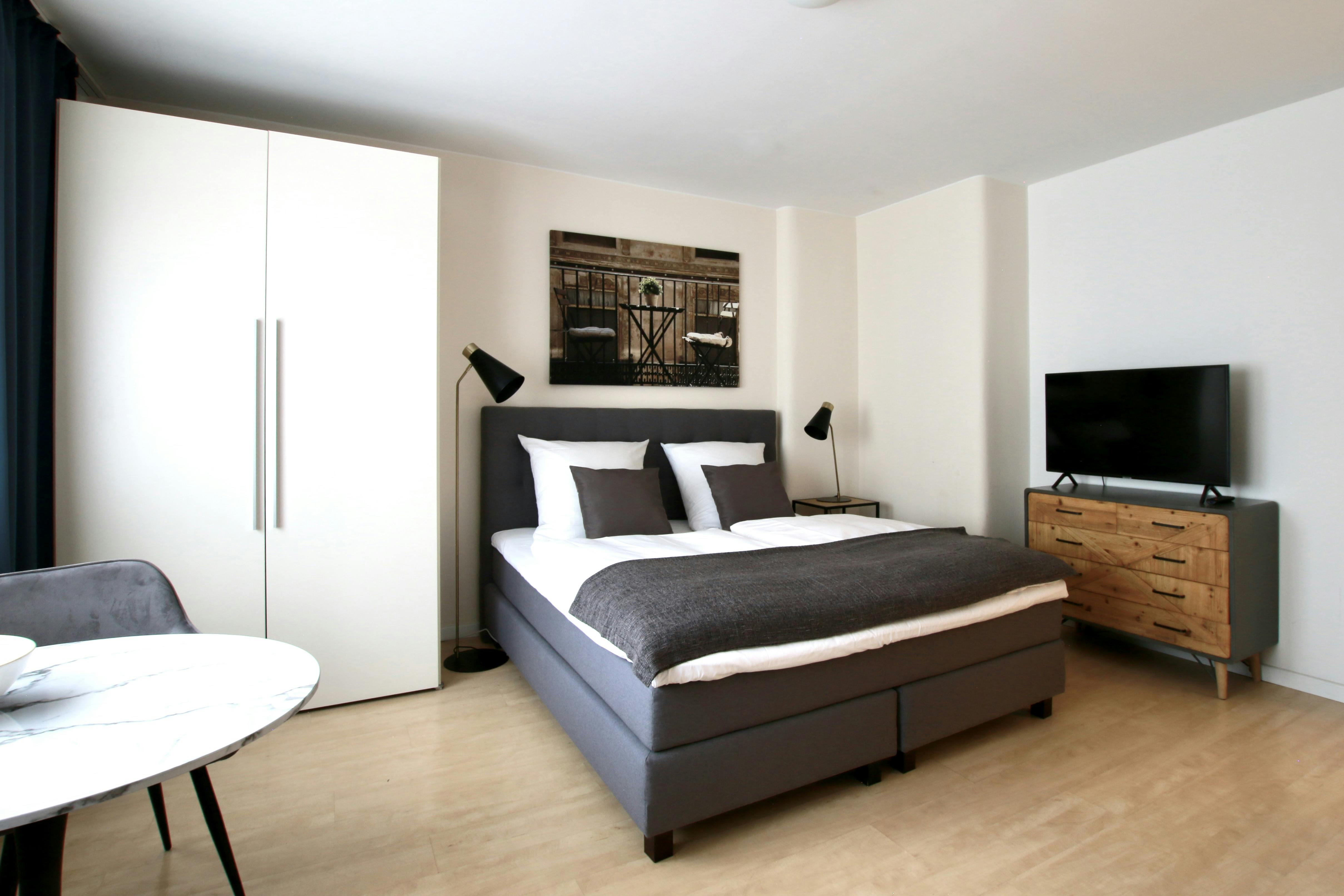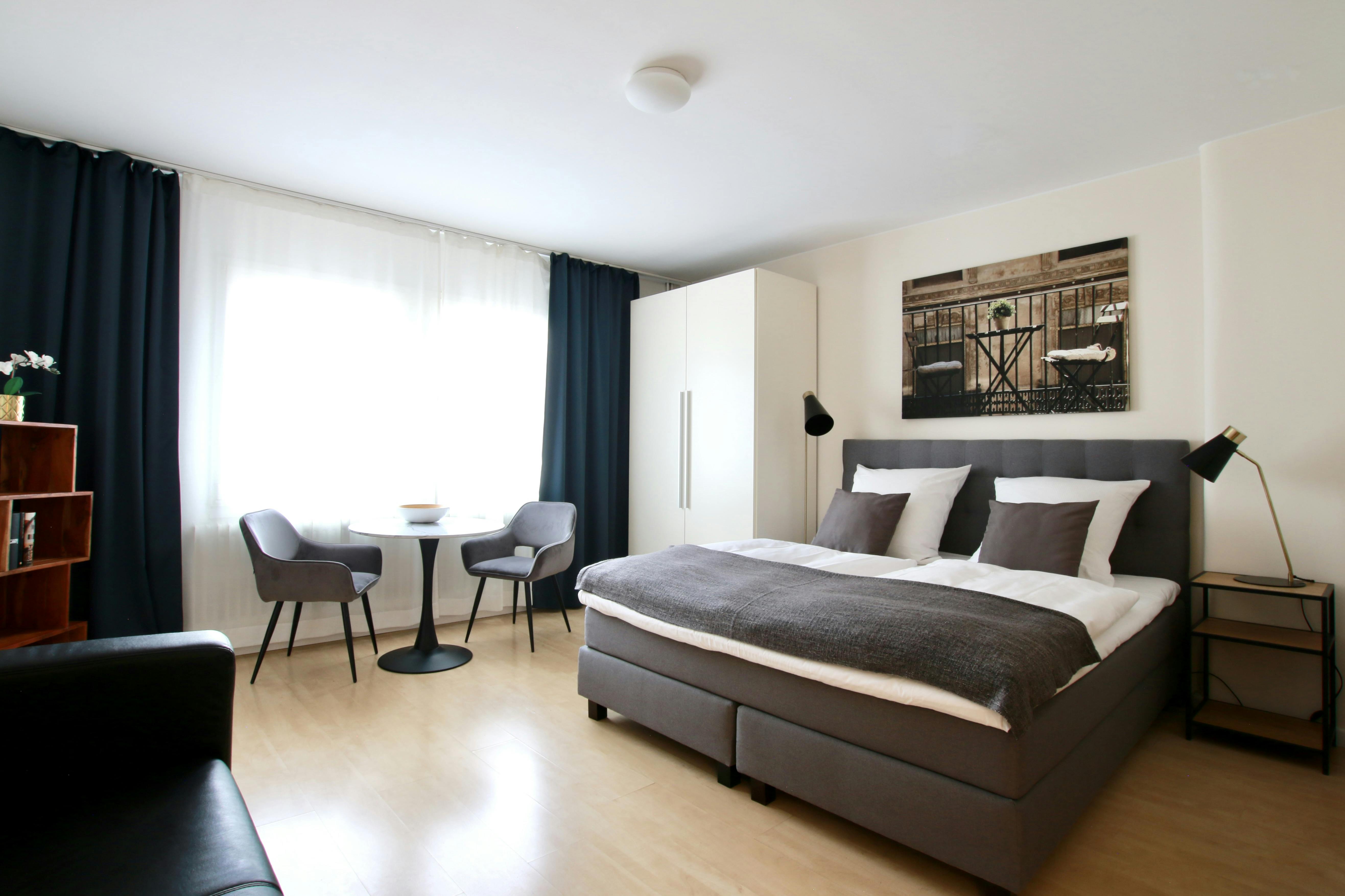 Studio apartment in the Belgian Quarter 32 sqm studio apartment (for 1-2 persons) on the 4th floor of a 6-story apartment building on a street corner in the vibrant Belgian Quarter. The living space with laminate flooring features a box spring bed (180 cm width), wardrobe, iron & ironing board, sofa, TV, a modern bathroom with shower, washing maschine & hairdryer, and a fully equipped kitchen with refrigerator, ceramic hob, kettle, coffee maker, toaster, and microwave. Free Wi-Fi is available. There is a laundry room with coin-operated washing machines and dryers in the basement. A weekly cleaning service (including the change of bed...