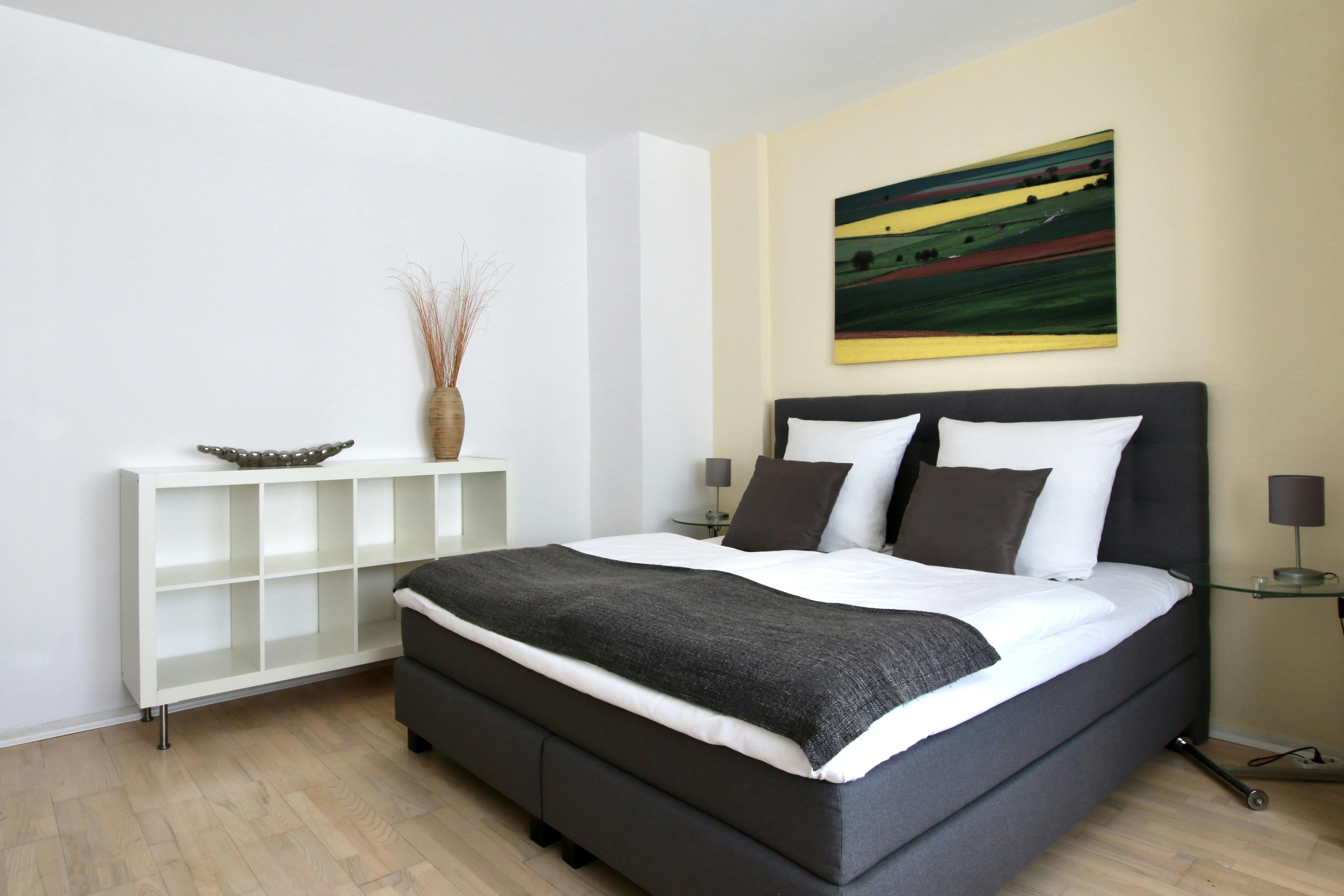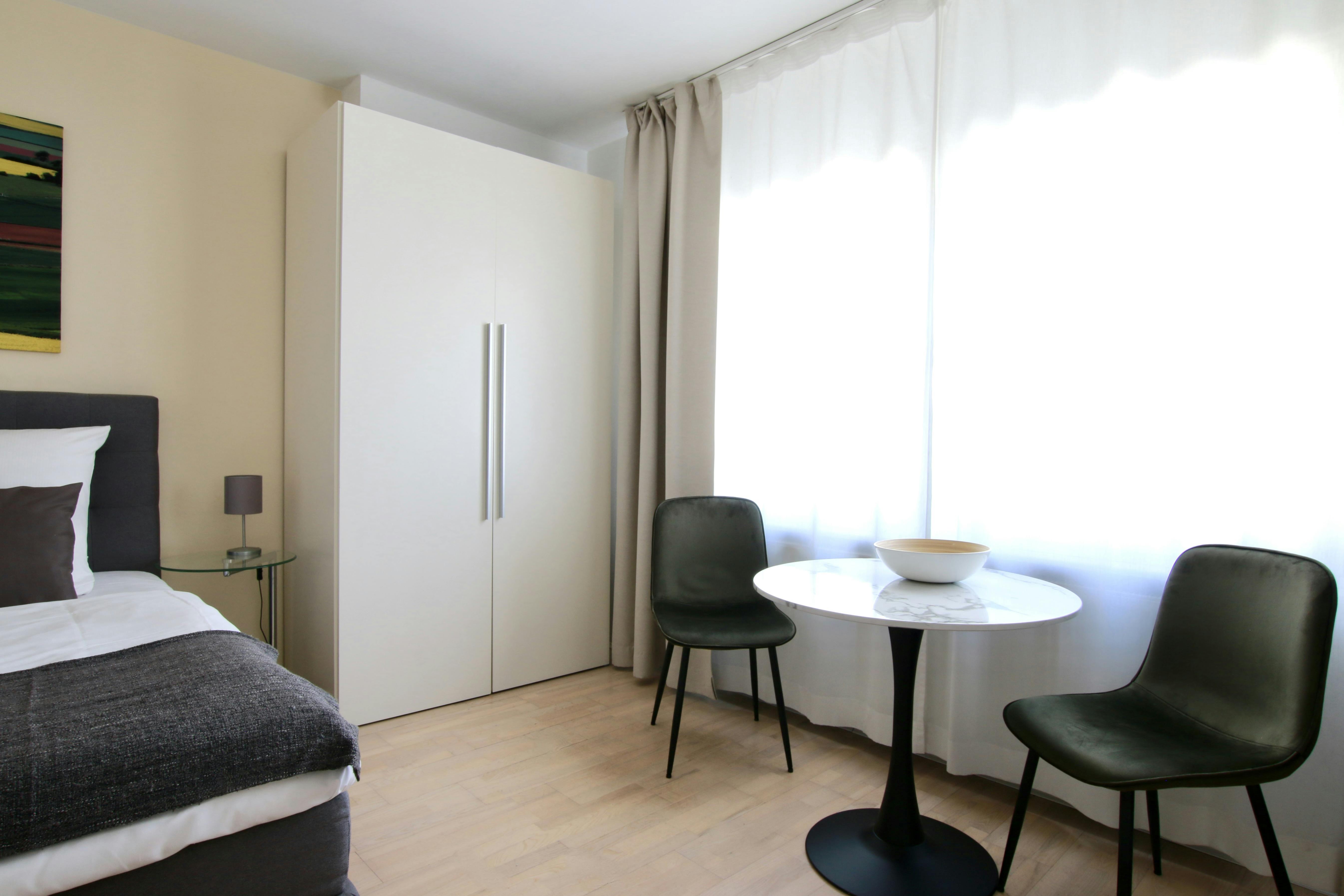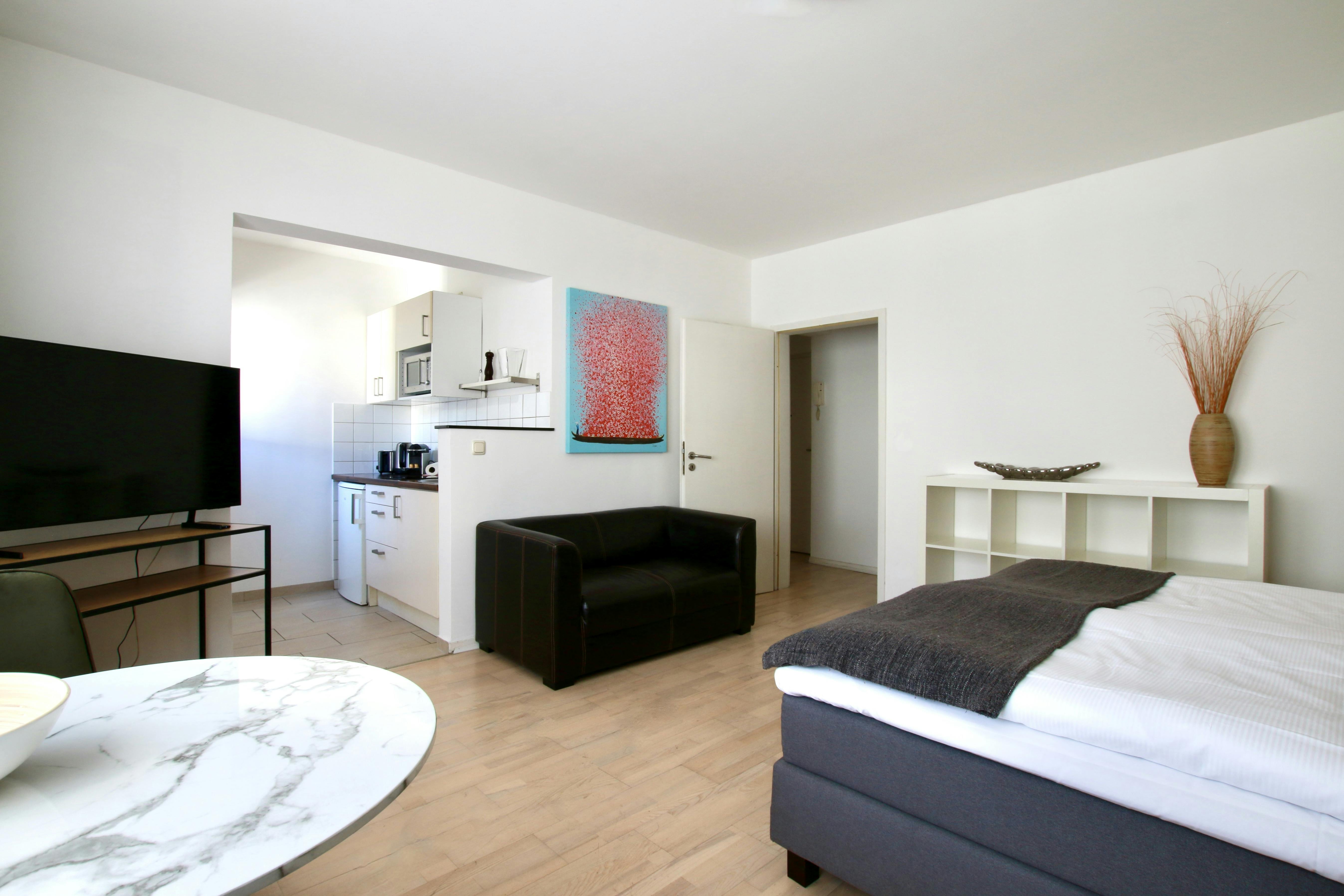 Beautiful apartment in the center of Cologne 31 sqm studio apartment (for 1-2 persons) on the 4th floor of a 6-story apartment building on a street corner in the vibrant Belgian Quarter. The living space with laminate flooring features a box spring bed (180 cm width), wardrobe, iron & ironing board, sofa, TV, a modern bathroom with bathtub, washing maschine & hairdryer, and a fully equipped kitchen with refrigerator, ceramic hob, kettle, coffee maker, toaster, and microwave. Free Wi-Fi is available. There is a laundry room with coin-operated washing machines and dryers in the basement. A weekly cleaning service (including the change of...