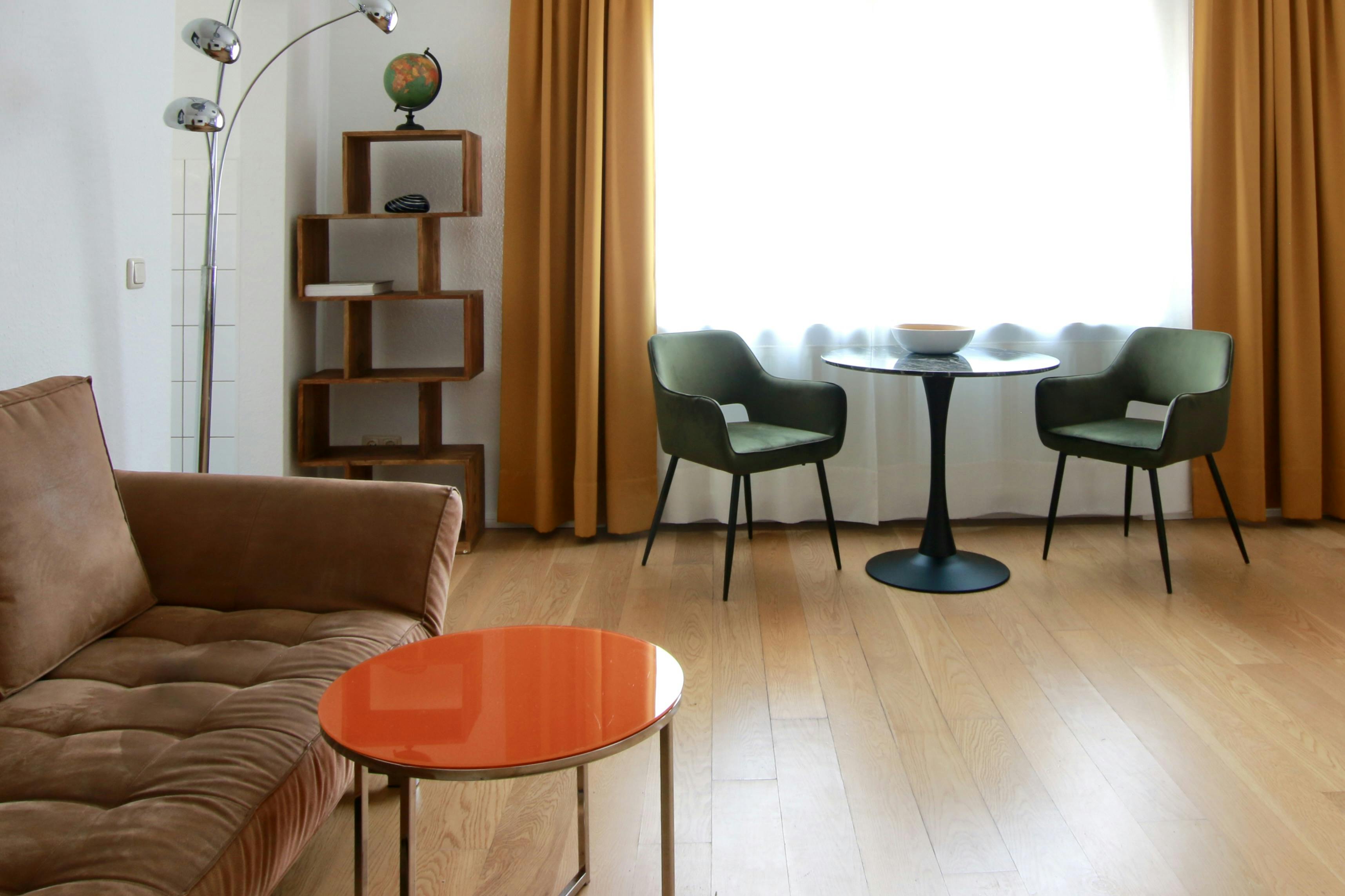 Nice apartment in the inner city 36 sqm studio apartment (for 1-2 persons) on the 4th floor of a 6-story apartment building at a street corner in the vibrant Belgian Quarter. The open-plan living room with laminate flooring features a box-spring bed (180 cm width), wardrobe, ironing board & iron, sofa, TV, a small bathroom with bathtub & hairdryer, and a fully equipped kitchen with refrigerator, ceramic hob, kettle, coffee machine, toaster, and microwave. Free Wi-Fi is available. There is a laundry room with coin-operated washing machines and dryers in the basement. A weekly cleaning service (including the change of bed sheets &...