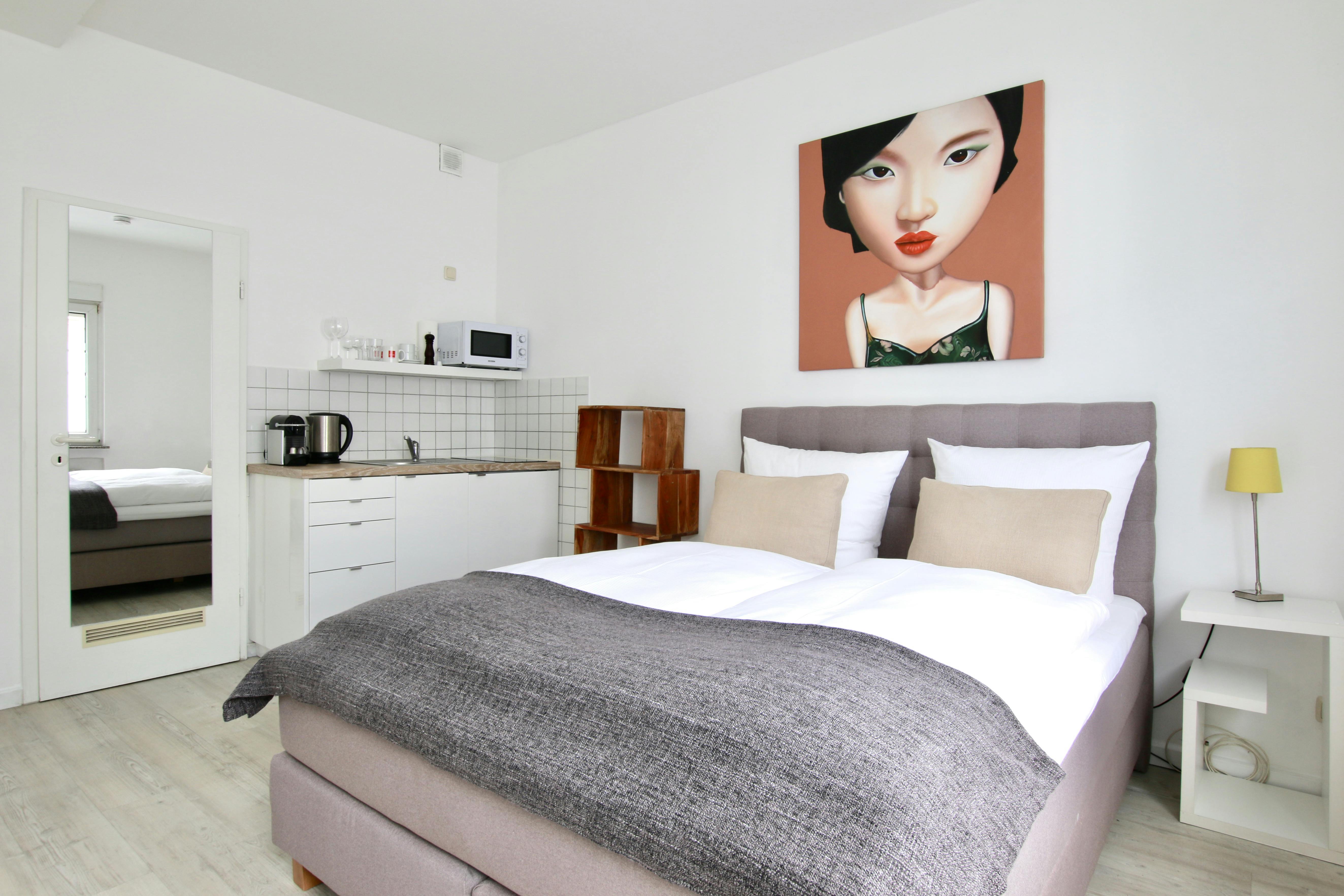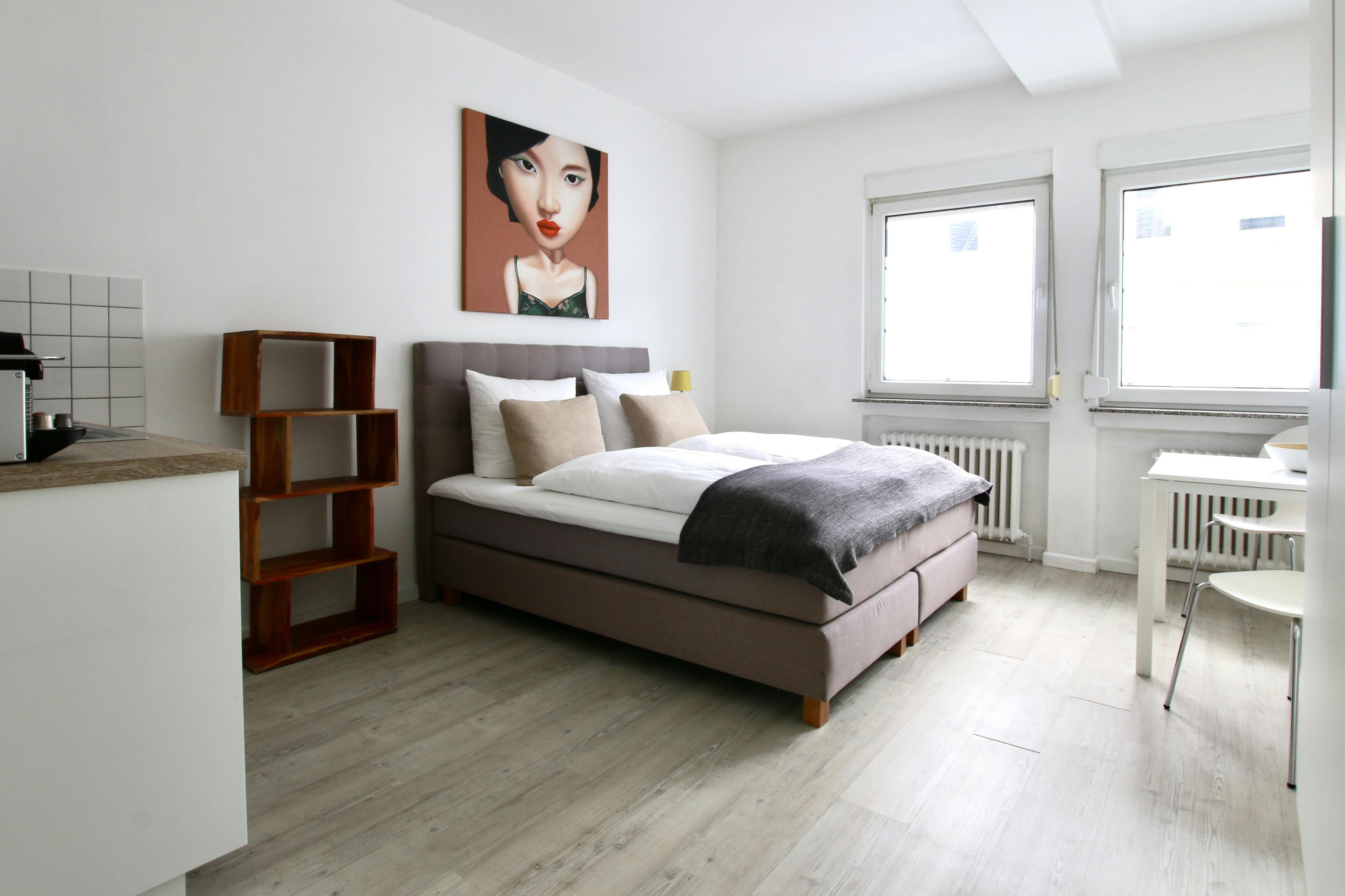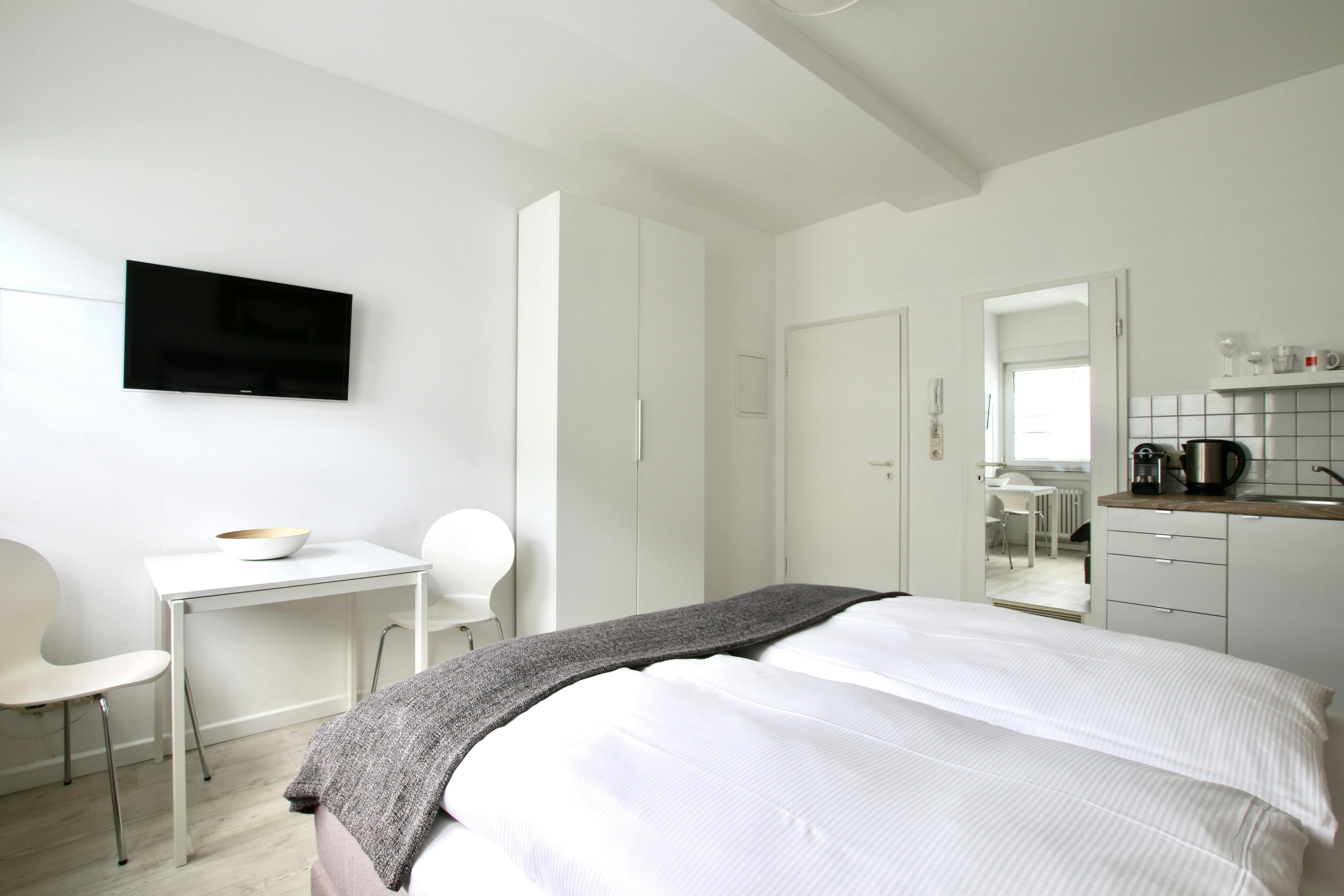 Schickes Apartment am Friesenplatz Das 25 qm Apartment ist komfortabel und modern eingerichtet. Es verfügt über ei bequemes Boxspringbett (1,60 x 2m), eine Küchenzeile mit Kühlschrank, Kochfeld, Kaffeemaschine und einem Wasserkocher. Das Bad ist mit einer einer Dusche ausgestattet. Ein Fernseher und kostenloses Wlan stehen auch zur Verfügung. Auf Wunsch ist ein wöchentlicher Putz-, Handtuch- und Bettwäscheservice für € 48,00 pro Woche möglich. Das Apartment liegt im modernen Zentrum Kölns im beliebten Belgischen Viertel. Das Viertel bietet alles was man von Köln erwarten kann: von traditionellen Brauhäusern und exquisiten Restaurants bis zu Szenebars und Nachtclubs. Hübsche Boutiquen und Cafés sind auch gleich um die...
