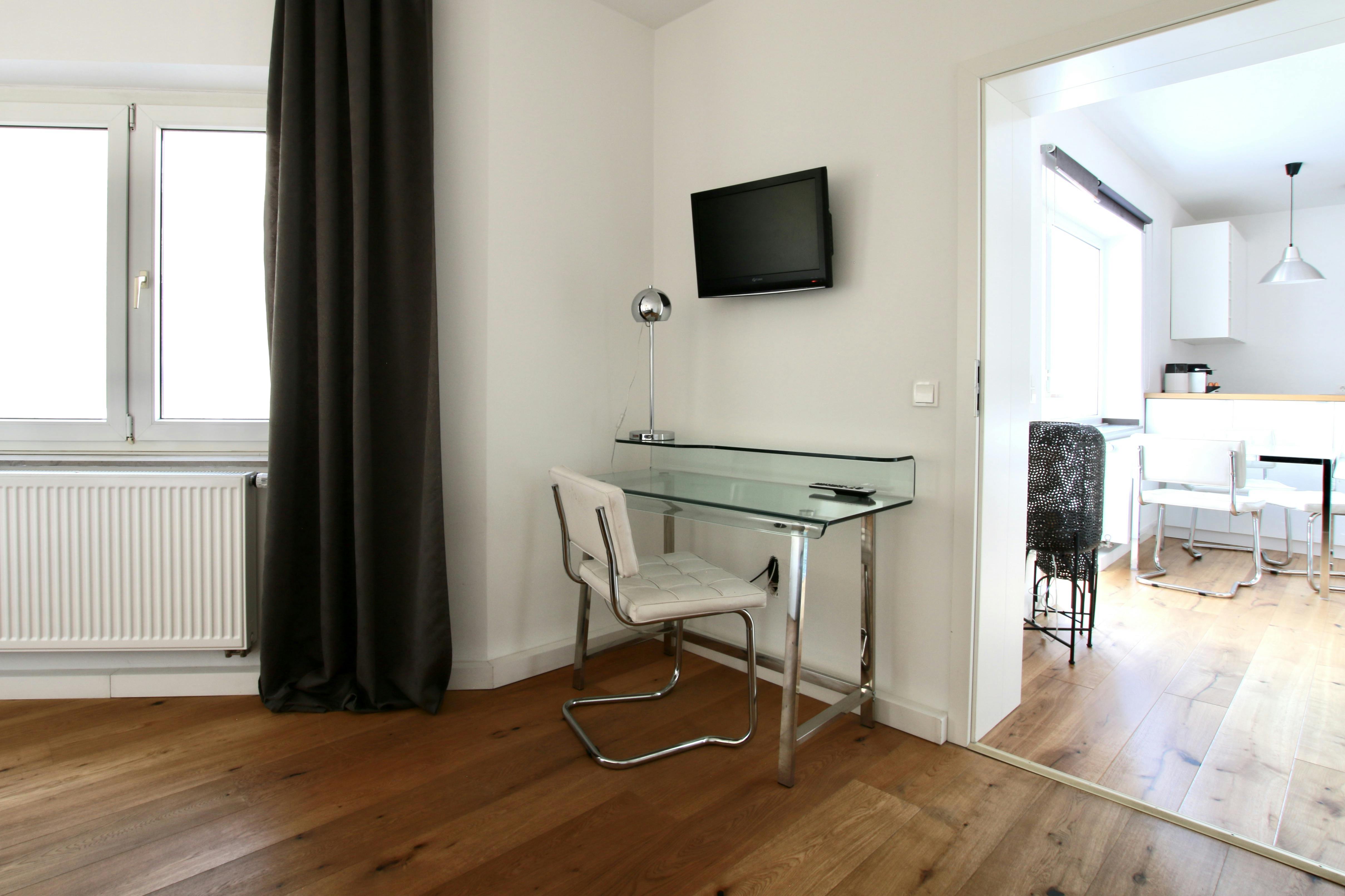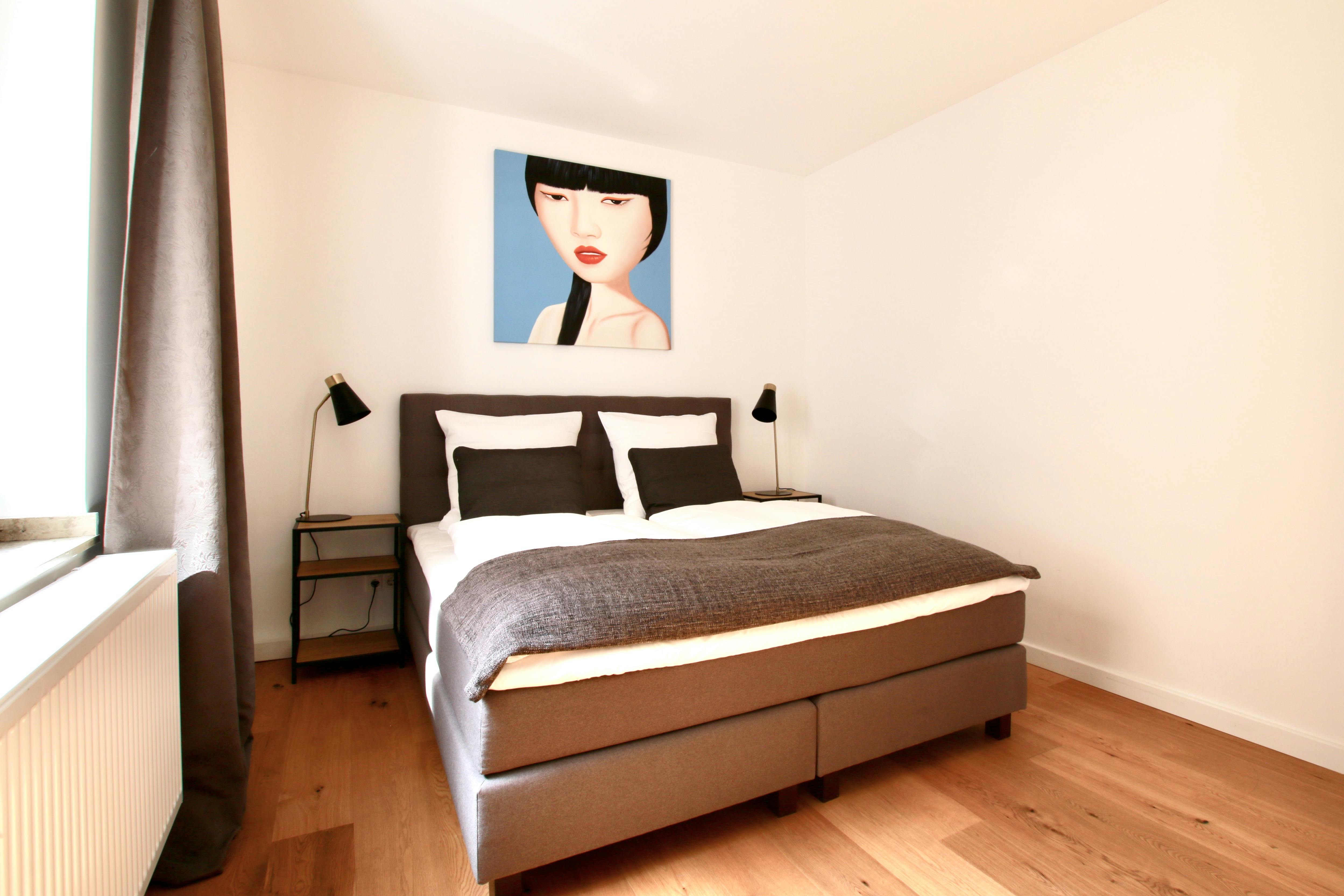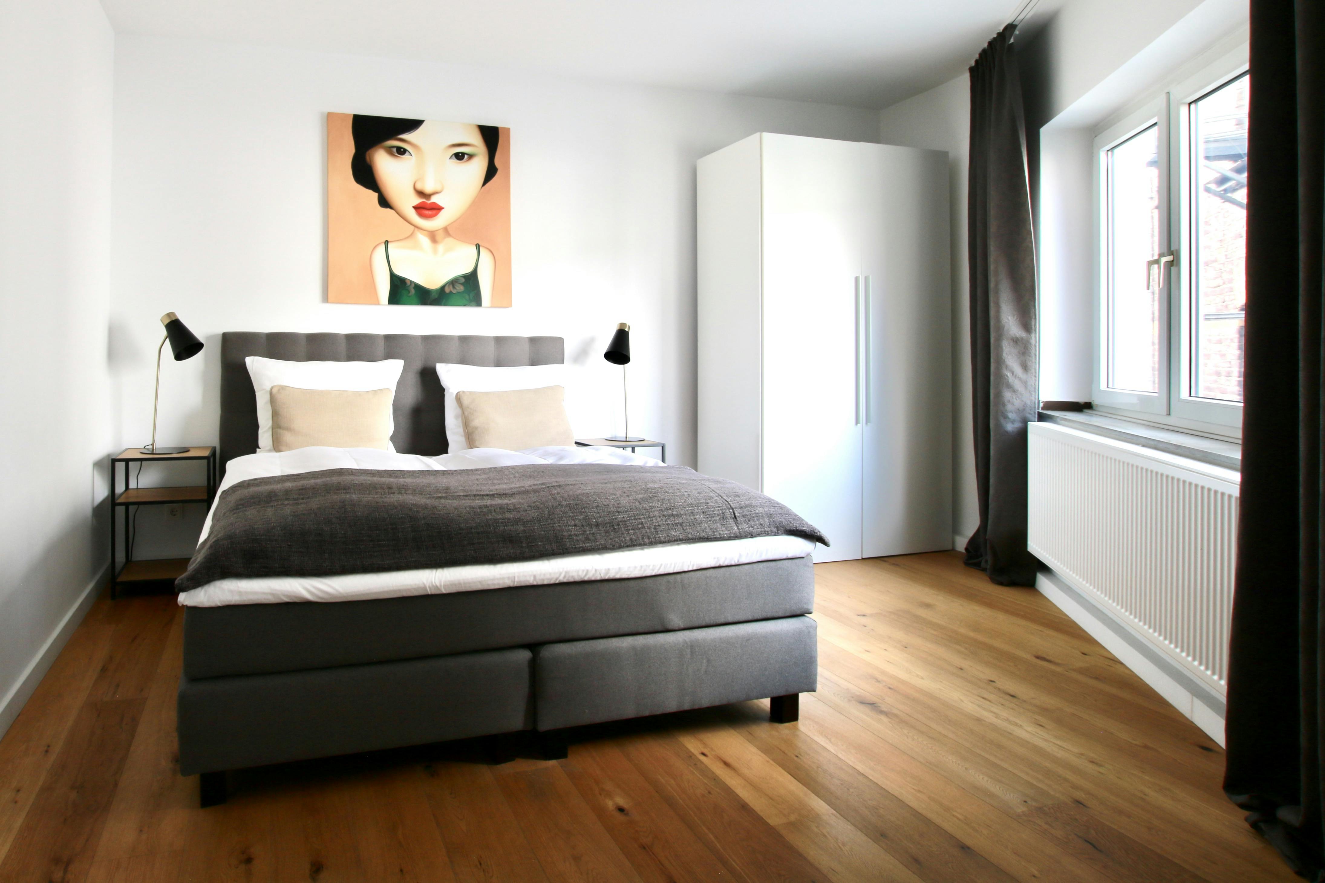 Apartment at Rathenauplatz 78 sqm premium apartment with 2 bedrooms and balcony on the 3rd floor in the rear building of a 6-story apartment building opposite the beautiful Rathenauplatz in Cologne's lively student district. The apartment has wooden floors and an open-plan living room with a sofa bed, TV, dining table, and fully equipped kitchen with refrigerator, ceramic hob, oven, kettle, toaster, and Nespresso machine. It has two bedrooms, each with a box spring bed (180 cm width), wardrobe, desk, and additional TV. The modern bathroom with natural light has a bathtub, separate shower, toilet, and hairdryer. Additionally, there is a...